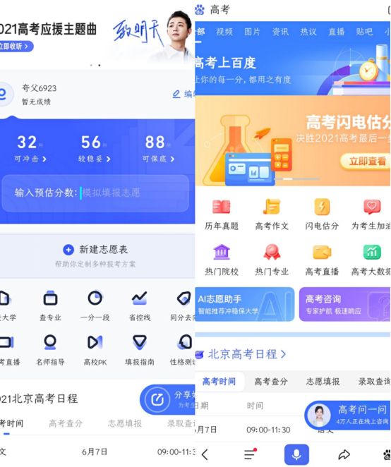 从最初的查大学、查分数线、测试专业,到形式更为别致的高考预测卷、名师高考直播,再到推出更加智能的志愿填报服务,百度可以说是早早就霸占了话语权。时至近几年,百度提供的核心服务并没有变,只是在形式、服务上有所包装与优化。