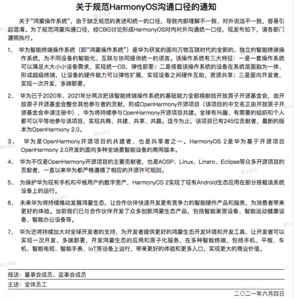 华为《关于规范 HarmonyOS 沟通口径的通知》