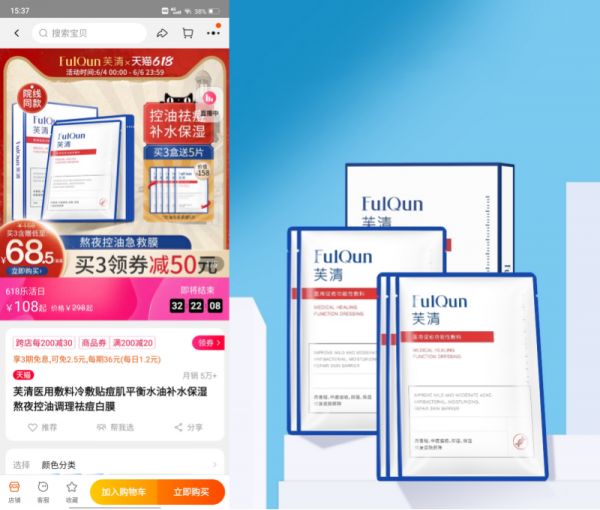 以油痘肌问题为方向,芙清医用促愈功能性敷料在618活动中销售表现突出,以5万+的销量取得了同类型产品中的第一。这款医用敷料的专利成分为十三肽,十三肽具有抑菌抗炎的效果,对油痘肌有平衡水油、修护维稳的作用。