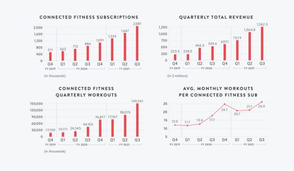 据其最新财报数据显示,2021财年第三季度(至3月31日),Peloton总营收同比增长141%至12.6亿美元,其中健身设备销售额为10.2亿美元,占比81%;订阅付费同比增长144%,达到2.4亿美元。整体毛利润率为35.2%,订阅付费的毛利润率为64.6%,远远大于产品销售的28.4%。