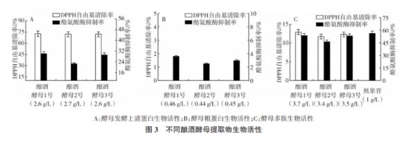 此外,酵母成分中也包含蛋白质和多肽类,因此酵母提取物可作为抗衰老和美白功效成分来使用。2020年,北京工商大学的付豪等人用反复冻融法结合超声波破碎法,分离提取了三种不同酿酒酵母蛋白,对比了这三种酵母蛋白的自由基清除效果,并通过酶解得到了酵母来源的多肽成分。结果显示,三种酿酒酵母上清蛋白都具有很好的清除DPPH的能力,2.6g/L左右的浓度其清除率能达到72%左右,同时,3.5g/L左右浓度的酿酒多肽,酪氨酸酶抑制率可达到50%左右,与1g/L的熊果苷相近。