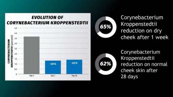 为了研究微生物对皮肤的影响,帝斯曼的科学家在一项研究中鉴定了200多种不同的细菌,发现克氏棒杆菌是导致面部发红的新靶点。而OXY 229 PF可以减少克氏棒杆菌水平,从而有效控制面部发红的症状,而且能够降低皮脂水平,起到抗衰老的功效。