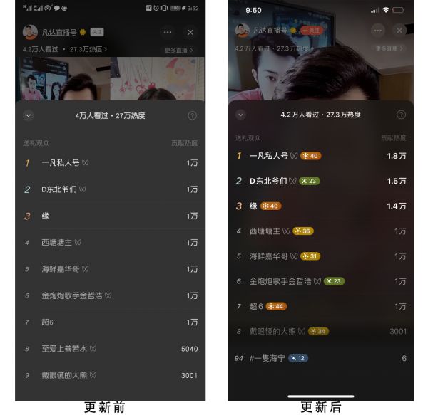 在直播间的热度排行榜中,打赏用户的名称旁加上了星符号,数字代表他氪金的登级。目前微信官方并未对等级对应的打赏金额进行说明,听说目前最高等级是56。