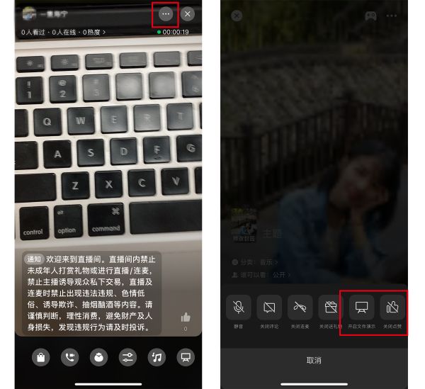 视频号直播页面的功能栏目里,新增“开启文件演示”和“关闭点赞”按钮。