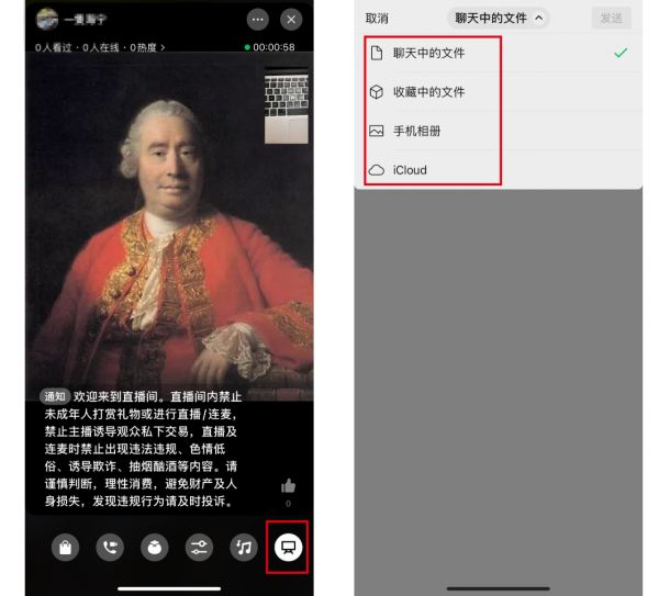 开启文件演示功能之后,在正式直播时可以通过“文件演示”播放相关文件。目前,在手机端上可选的文件来源有聊天中的文件、收藏中的文件、手机相册以及iCloud里面的文件。该功能使手机端直播更方便了,主播想要分享文件内容时,不用再专门通过电脑端录制。
