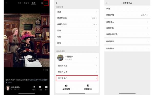 个人中心主页新增了“创作者中心”按钮,其内集合了与创作、直播有关的子功能,包括视频号认证、原创计划、直播收入、直播任务、商品橱窗和创作者指南,将节省创作者使用及查找相关功能的时间。