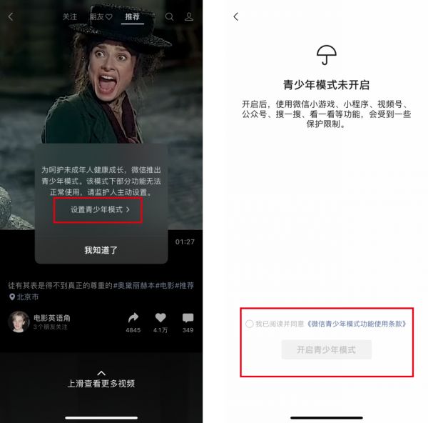 更新后,进入视频号分区,会出现青少年模式的自动弹窗提示,阅读并同意使用条款之后,即可选择开启该模式,视频号使用环境更为规范化。