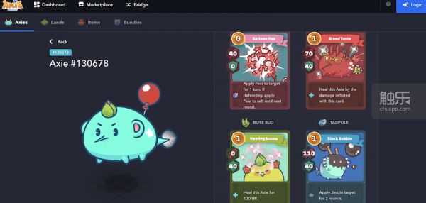 至于“有点像《炉石传说》”的部分,实际上应该说是游戏里的卡牌部分。《Axie Infinity》在战斗上有些卡牌要素,玩家通过卡牌指挥自己的“阿蟹”,使用招式进行攻击、防御,与游戏中的其他“阿蟹”战斗,其中还有一些技能变化——在这里,“阿蟹”是游戏标题中“Axie”的中文简称,作为养成物,类似《宝可梦》里的宝可梦。每个“阿蟹”有固定的4个技能,以卡牌的形式出现在牌组和战斗里。抽牌、支付法术力、打出技能卡,相较于《炉石传说》,我觉得它更像是联机版的《杀戮尖塔》。