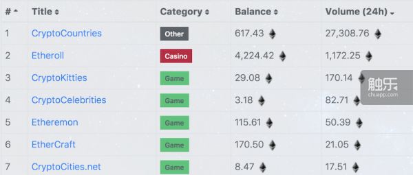 当时的ETH应用排行,第一名就是《加密国家》,只不过没有被算到“游戏”分类里