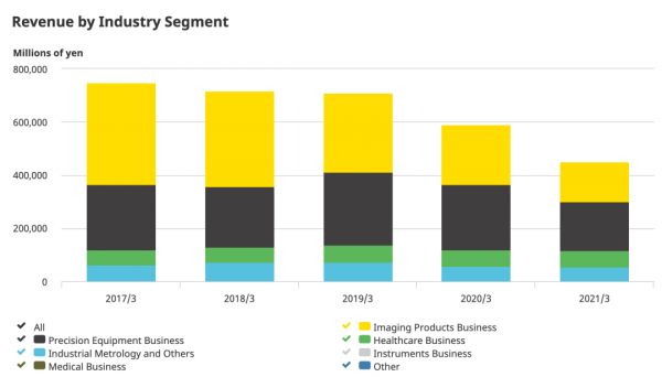 影像部门作为尼康的重要业务组成,尽管在尼康发布全画幅无反相机Z6II、Z7II后,其销售收益超出了之前的预期,但由于新冠疫情的影响导致需求疲软,加上本身市场的萎缩,单位销售额下降。因此,2021财年影像业务收入同比大减33.5%,录得收入1502亿日元(约合人民币11亿元)。