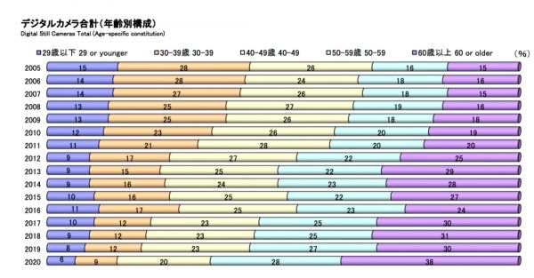 从购买者年龄构成来看,数码相机的购买人群大部分集中在30岁以上,年龄在29岁以下的购买者到了2020年已不足6%,而60岁以上的购买者比重则是扩大到38%。