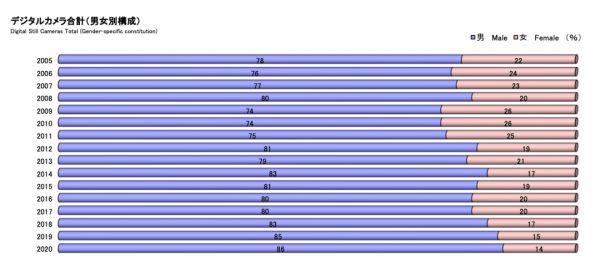 从购买者性别构成来看,购买数码相机的人群大多是男性,而且这比列在进一步扩大,到2020年,男性购买者占到了86%,女性则只有14%。