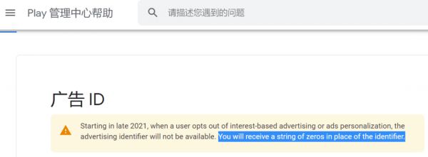 一直以来,在 Google Play 上架的 App 通过广告 ID 来向 Android 手机用户提供个性化广告,这方便了那些靠广告变现的开发者。然而根据谷歌的“Play 管理中心帮助”页面最近的更新显示,谷歌将不会再向开发者提供那些不想看个性化广告的用户的广告标识符。如果开发者想要像以往那样获取广告标识符,会得到“一串 0”。