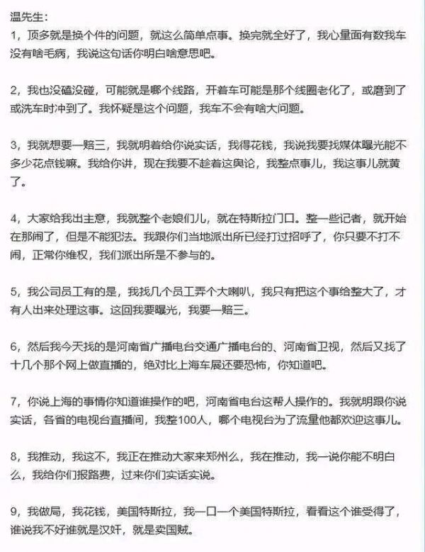 此外,在5月28日发生的特斯拉车主温先生反应的特斯拉刹车失灵要求特斯拉一赔三的事件,有媒体报道称,有录音显示这是这位特斯拉车主明知道自己的车没有问题,就是需要一赔三,还被爆出是背后有人操控。(下图为媒体整理的录音内容)