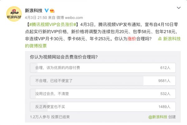 新浪科技在微博上进行的投票“你认为视频网站会员费涨价合理吗?”的结果显示,有78.4%的网友都认为“不合理”,认为“合理”的仅占5%。