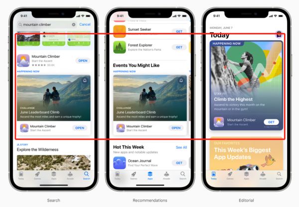 App内活动可显示在搜索结果中,以及“Today”、“游戏”和“应用”标签的编辑选荐和个性化推荐中。