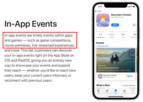 App内活动是指应用/游戏内的“及时活动”。所谓“及时活动”,苹果解释说最好是当前/即将发布的重大活动,例如游戏比赛、新电影首映、直播体验等。