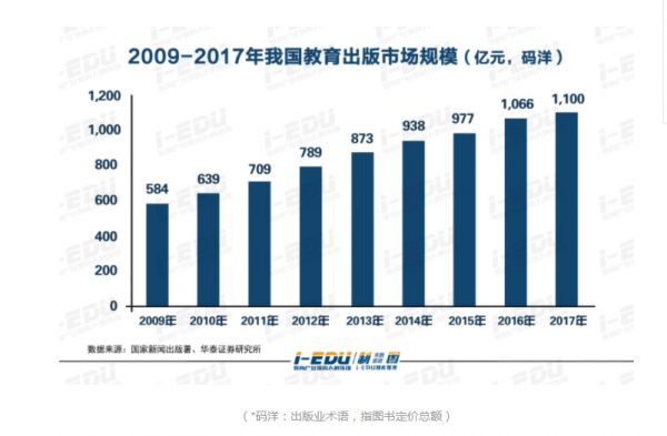 业内人士称,中国出版业70%以上的利润来自教材教辅。根据国家新闻出版署的数据,我国图书市场在2017年的规模约为1800亿元,其中教育出版市场规模约为1100亿元。2019上半年图书出版业,教辅类图书位居第三位,码洋规模达到了63.72亿元,且继续保持高增速。在线下渠道,有且只有教辅类图书维持着正增长。