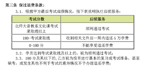 这类保过班中往往承诺签协议,介绍中往往自称和学校有关系,在自己分数差5分以内可以保过自己理想的专业和学校,在不过的情况下进行全额退费。