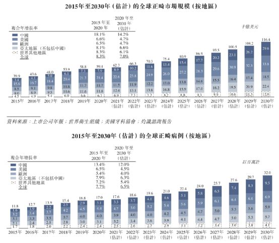 隐形矫正是一个正处上升期的市场,灼识咨询的报告显示,全球正畸市场零售销售收入已从2015年的399亿美元增至2020年的594亿美元,复合年增长率为8.3%,其主要源于中国、美国、欧洲国家及其他亚太地区区域的正畸市场快速增长。