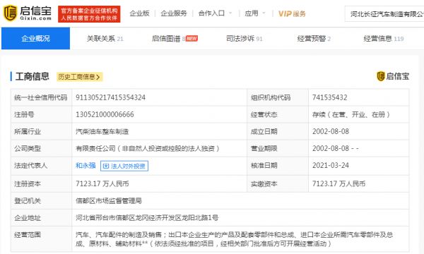 启信宝显示,河北长征汽车制造有限公司(即长征汽车)由邢台龙冈投资发展有限公司100%控股,而后者则由邢台市信都区财政局100%控股。