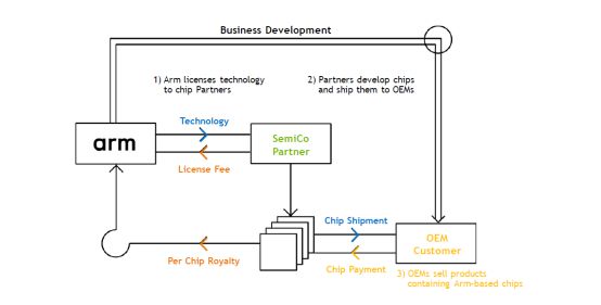 目前Arm的商业模式为IP授权,即通过知识产权授权的方式,收取一次性技术授权费用和版税提成。Arm只专注于设计芯片蓝图,代工或生产由授权客户自行解决。Arm收入包括前期授权费(license)和版税(Royalty),其中版税是按照使用Arm的芯片的出货量,按比例抽成。
