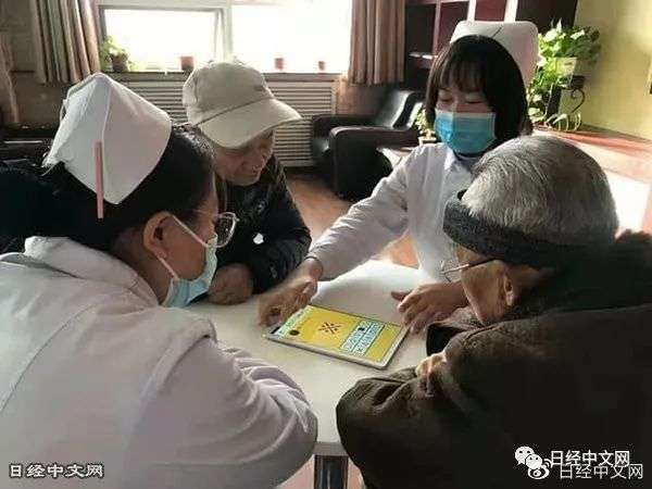 在中国陕西省的一家老年人设施,入住的老年人额头上戴着装有传感器的头带,正在用平板电脑玩游戏。随着“脑活跃度”的高低,逐一解答简单的计算题和智力题。这是在使用源自日立高新技术公司和日本东北大学的初创企业NeU开发的痴呆症预防系统。