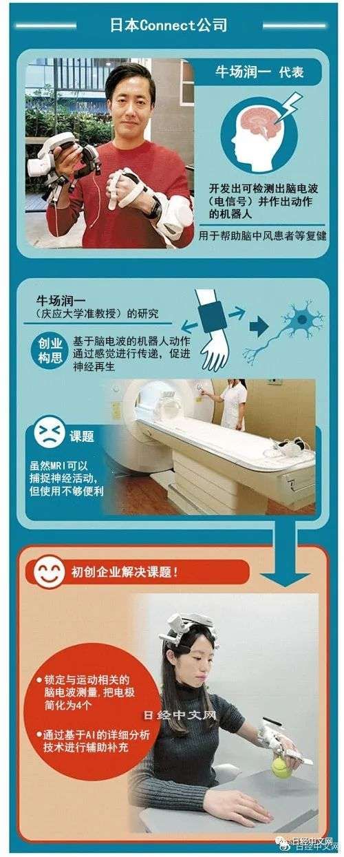 此外,脱胎于庆应大学的初创企业Connect开发出了测量脑电波的仪器以及动作与脑电波联动的机器人。用于帮助脑中风等疾病导致手部麻木的患者进行复健。据Connect代表牛场润一介绍称,通过将脑电波测量和人工智能分析技术结合在一起,可使机器人作出精确细致的动作,从而“促进脑部新神经回路的形成”。