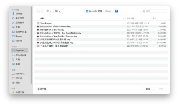 但如果我们进一步观察,会发现并非所有的应用都有边栏,例如苹果出品的 Keynote 讲演,就和 Windows 上的 Word 一样,都是打开应用后会弹出文件选择窗口,在应用界面内反倒没有文件选择的界面。这里就涉及到文件的归属和存放位置问题,我们在这里不做展开。目前我们只需要明白,边栏和列表是用来选择文件的。