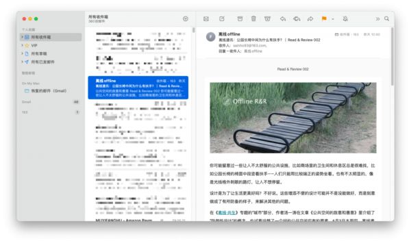 这种设计理念的优劣暂且按下不表,但是根据这种理念,应用内就必须有相应的界面,来承担选择文件的作用,这便是边栏的作用。并且由于文件通常是多层级的,仅一栏很难合理地呈现,所以不少应用还要设计专门的一栏,来展示文件列表。例如在邮件应用中,边栏展示的是邮箱的不同文件夹,中间一栏是邮件列表。