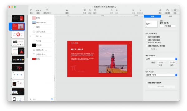 最后,Mac 应用中还会常见到「检查器」。为了直观地了解检查器的作用,各位可以打开 Keynote 讲演,检查器就在界面的右侧。