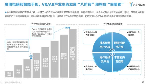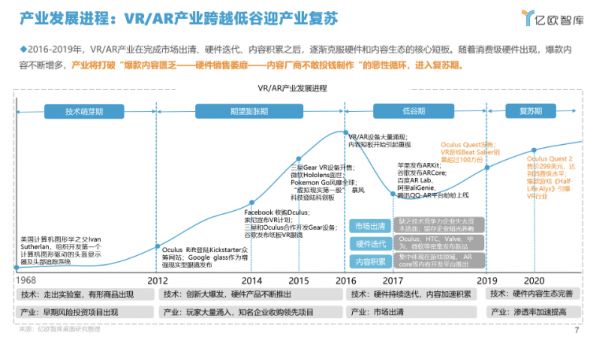不过,2021年应该就是“出谷”的日子。亿欧智库经过大量桌面研究认为,VR/AR产业在克服硬件和内容生态核心短板后,将打破“爆款内容匮乏——硬件销售萎靡——内容厂商不敢投钱制作”的恶性循环,进入复苏期。