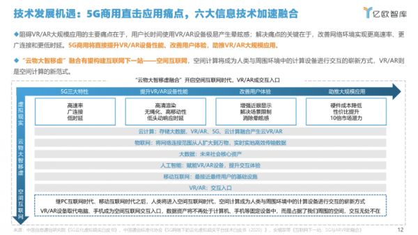 首先,技术层面上,无论从时下最热门的5G商用趋势,还是“云物大智移虚”为代表的新一代信息技术融合的长远展望,VR/AR走向大规模应用都将是必然。亿欧智库访谈了多名业内专家,受访者对此均表示认可,争议点只在于时间早晚。