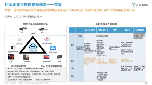 最后,生态层面上,亿欧智库依据VR/AR生态圈层特征和演化机制,重点研究了巨头企业和中小企业的生态布局策略,并认为搭建“CPU+OS”统一的技术体系和配套商业模式,是形成海量级VR/AR应用的关键,而这一关键将由苹果、Facebook等推动产业链生态融合的巨头企业掌握。