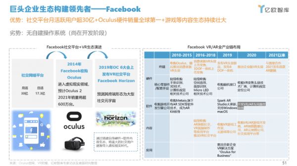 两家巨头朝着产业生态融合不断发力,整个VR/AR产业发展都将受益。此外,亿欧智库也重点研究了谷歌、华为等其他巨头的VR/AR生态构建情况,这些企业在未来都将成为推动VR/AR产业繁荣的主力军。