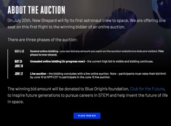 如果碰巧你也是富豪,可以登录蓝色起源竞拍这个座位。当然,普通人也可以去随时围观下这场拍卖——目前,一个座位已经被叫上了350万美金的高价,不过这个能去外太空的价格还不如孙宇晨当年拍卖和巴菲特吃一顿饭贵。目前350万美金还不是最终价格,最终入围的富豪们将要在6月12日,也就是下周参与一场线上公开拍卖,最终争抢一个座位。