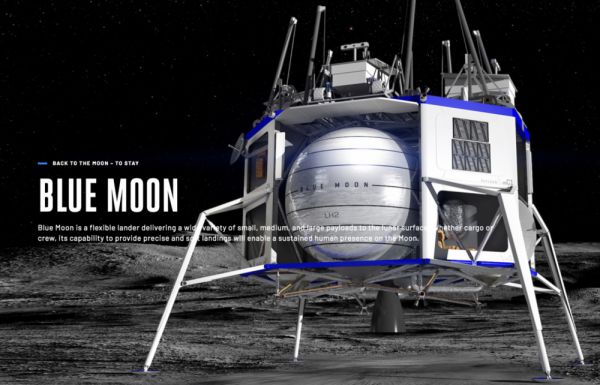 蓝月计划中,蓝色起源开发了一种灵活的着陆器,其最高负荷高达6.5吨,并能为货物和乘客提供精准的月球软着陆。