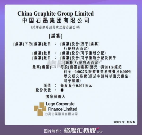 港交所信息显示,6月1日,中国石墨集团于向港交所提交上市申请书,拟香港主板上市。Lego Corporate Finance Limited(力高企业融资有限公司)为其独家保荐人,普华永道为其审计师。