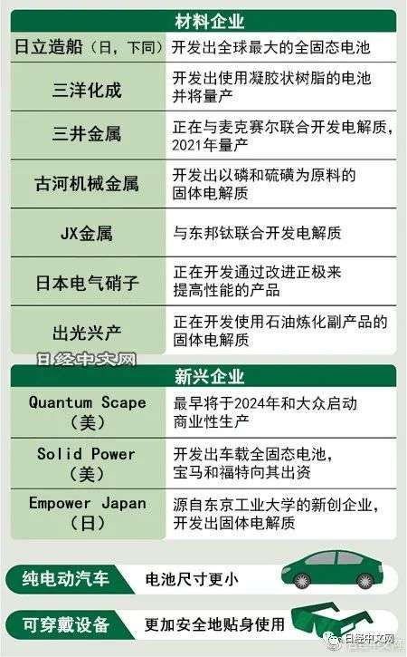 现有锂电池方面,日本化工企业一直掌握着“正极材料”、“负极材料”、“隔膜”、“电解液”4种主要材料,有观点认为,在这样的背景下,日企的优势也能在固态电池领域发挥作用。对日本的零部件厂商和材料企业来说,正式拉开序幕的电池革新是一次良机。