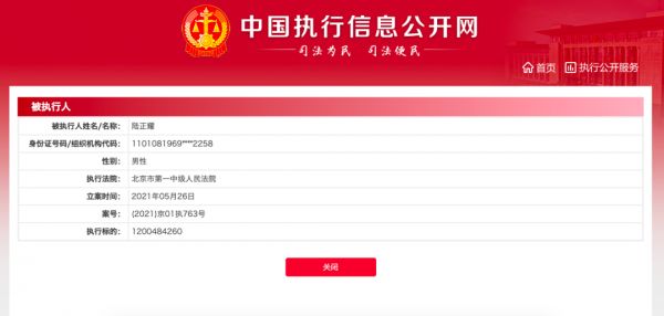 天眼查App显示,近日,陆正耀被北京市第一中级人民法院列为被执行人,案号(2021)京01执763号,执行标的1200484220元。
