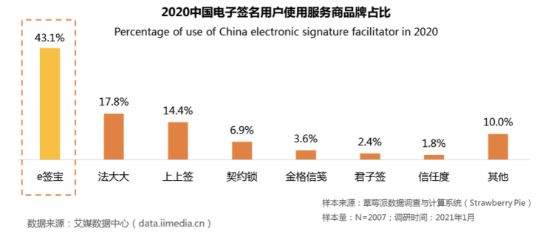 据艾媒咨询发布的《2020-2021年中国电子签名行业发展现状及用户调研分析报告》数据显示,2020中国电子签名用户使用服务商品牌占比上,e签宝达到43.1%,占据市场份额首位。