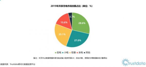 2019年时,街电、小电、怪兽充电、来电“三电一兽”的市场格局基本形成。根据TrustData移动大数据监测平台的统计,2019年,上述4家企业的市场份额占比分别为28.6%、27%、25.1%和15.6%,来电科技位居第四。