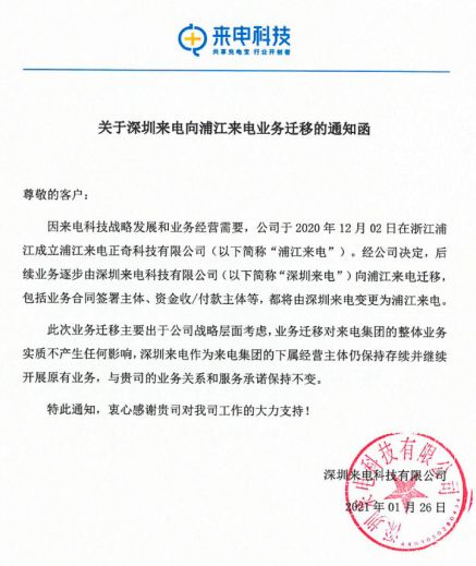 根据来电科技官网首页发布的《关于深圳来电向浦江来电业务迁移的通知函》,因战略发展和业务经营需要,深圳来电于2020年12月02日在浙江浦江成立浦江来电,后续业务逐步由深圳来电向浦江来电迁移,包括业务合同签署主体、资金收/付款主体等,都将由深圳来电变更为浦江来电。