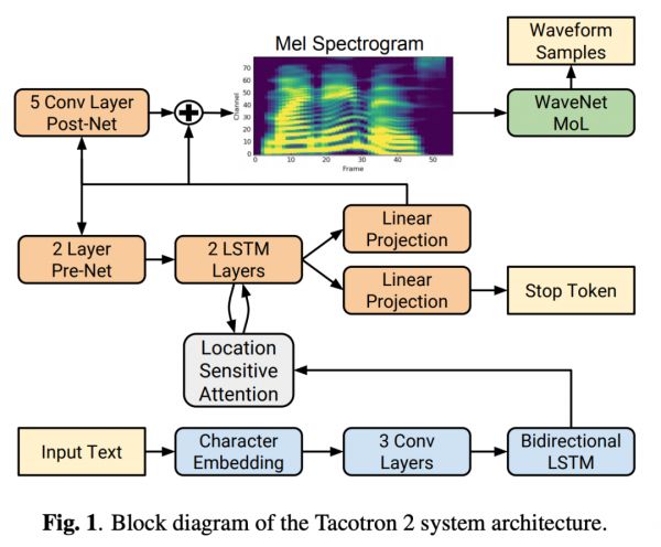 帮助 UberDuck AI 实现文本到语音生成的 Tacotron2 是 Google 发布的基于深度学习的端到端的语音生成模型,模型分为:具有注意力的循环序列到序列特征预测网络,该网络根据输入字符序列预测梅尔谱帧的序列,和 WaveNet 的修改版,可生成以预测的梅尔谱帧为条件的 time-domain waveform 样本,效果更接近自然人声。