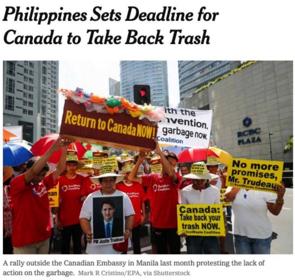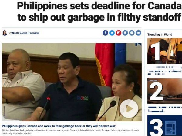 据纽约时报、福克斯新闻报道,菲律宾总统杜特尔特要求加拿大在5月15日之前收回数年前送到菲律宾的数吨垃圾,并表示如果加拿大不遵守,他将亲自把这些垃圾运回加拿大。