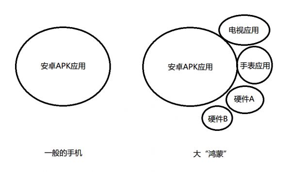 将手机版和物联网版鸿蒙算到一起的话,大“鸿蒙”对“应用”的定义超出了单设备(手机)单平台(安卓),在手表、电视上的应用界面,以及其它无界面的智能家居开关状态等都可以被手机调用,手机的应用也可以被其它屏调用。