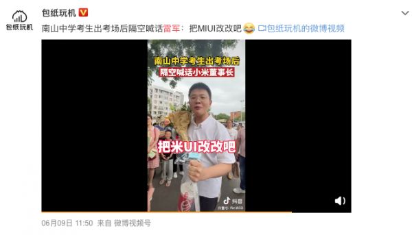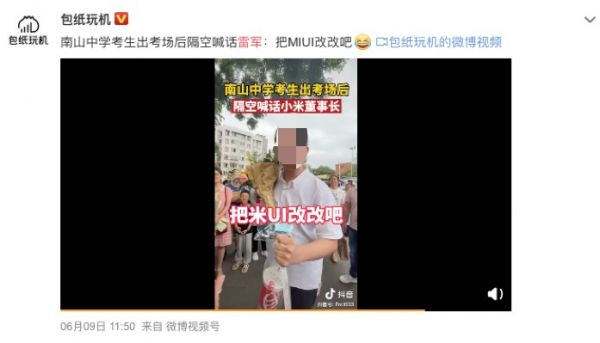 对于大家来说,前两个选项算是司空见惯的,而最后一个则确实是闻所未闻,不过,在刚刚结束的高考中还真有考生这么干了。南山中学的一位考生在走出考场后,面对来自记者的采访,说出了自己的心声:“麻烦雷总啊,把MIUI改改吧,那真的没法用啊现在。”