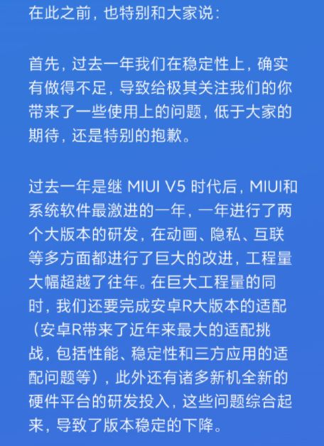 出现这种情况,基本上就是与功能太多,测试时间不足有关,虽然MIUI团队的人员对比过去已经增加了不少,但是相对的需要优化和测试的功能也是成倍增加。许多功能没有进行完整的测试就直接放出,而且,Android版本的大改也严重影响了适配和优化进度。