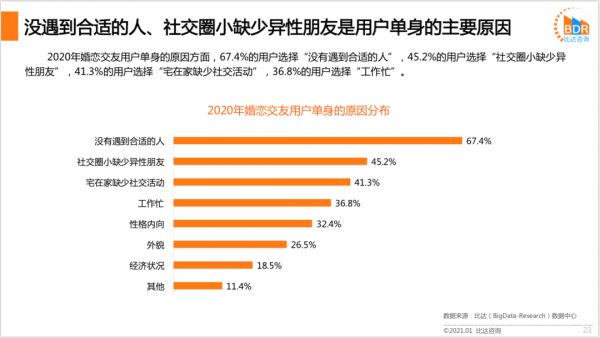 比达咨询指出,2020年,67%的婚恋交友用户单身的原因是“没有遇到合适的人”,而也有很多用户单身的原因是“社交圈小缺少异性朋友”、“宅在家缺少社交活动”。