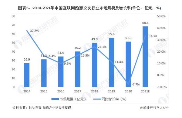比达咨询数据显示:2020年我国互联网婚恋交友行业市场规模为51.3亿元,预计2021年将达到68.4亿元。从市场规模上看,互联网婚恋交友市场不算大,为何在移动互联网时代,恋爱社交成为了“香饽饽”?
